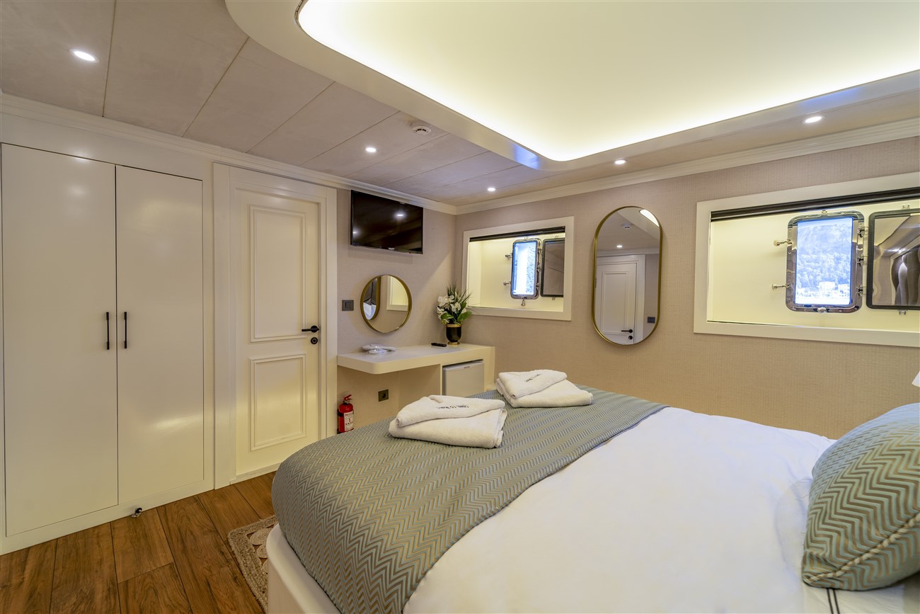 Built in 2021 and stretching 40 meters in length, Queen of Makri departs from the Fethiye harbor. With 6 cabins—2 master, 3 double, and 1 twin—it comfortably hosts up to 12 guests. Whether you’re traveling with family or close friends, it offers a seamless blend of space and privacy. The gulet is equipped with Wi-Fi, music system, LCD TV, jacuzzi, fishing gear, and satellite connection—everything you need, right at your fingertips.