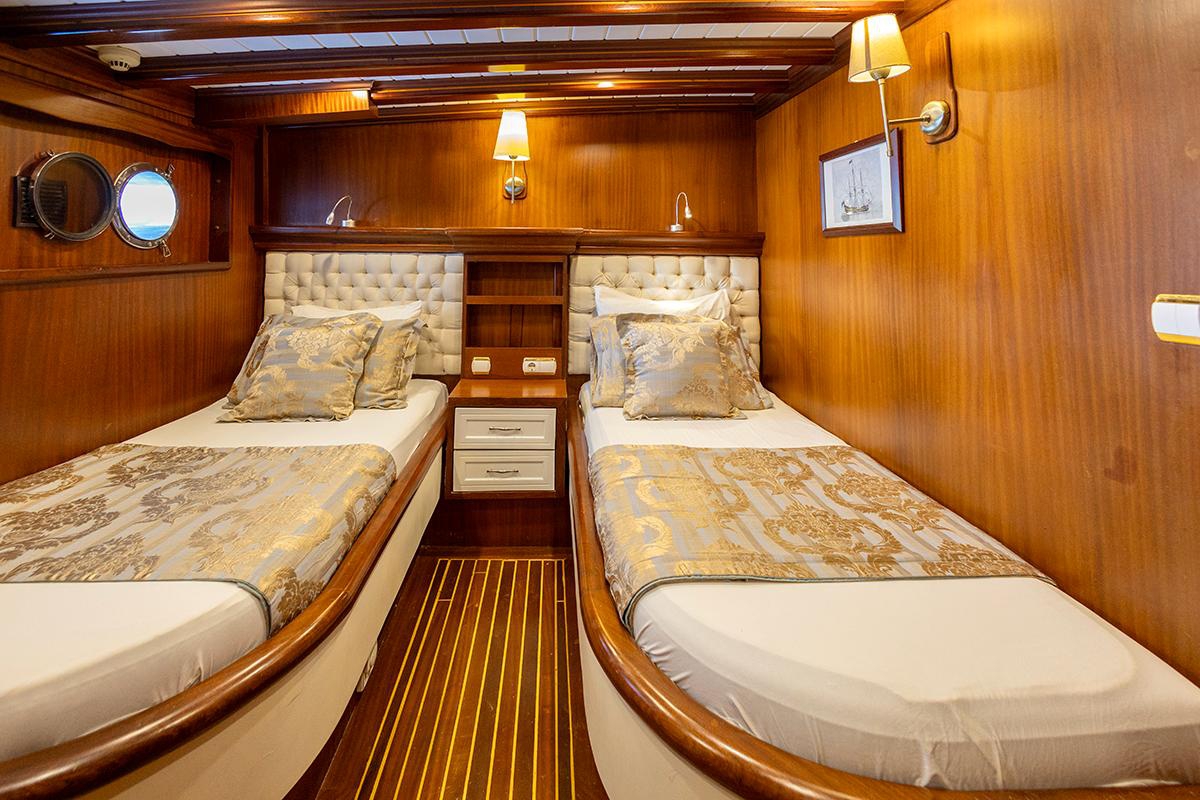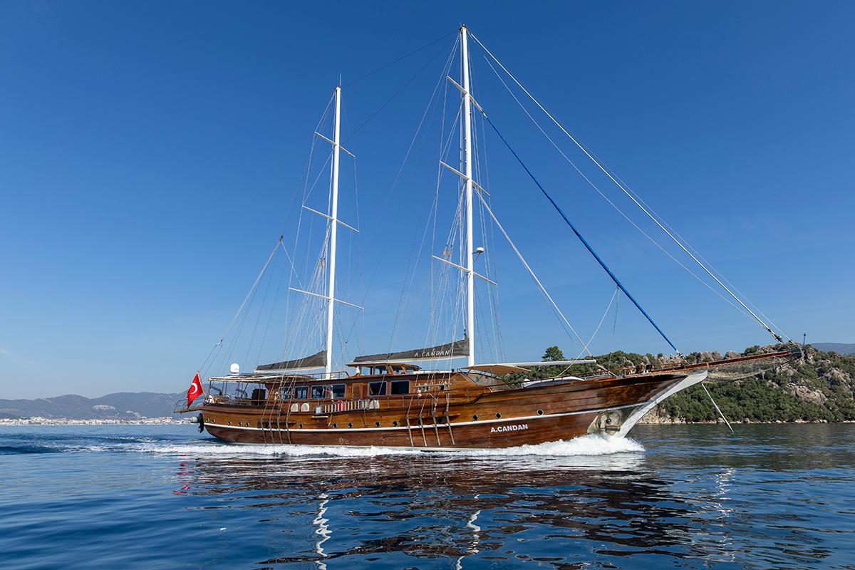 A. Candan is a gulet based in Marmaris, 35 metres in length, with eight cabins on board. The layout includes 2 master, 2 double, 2 twin and 2 triple cabins, offering a balanced and comfortable setting for larger groups. With accommodation for up to 18 guests, it never feels crowded. Everyone has space that belongs to them.