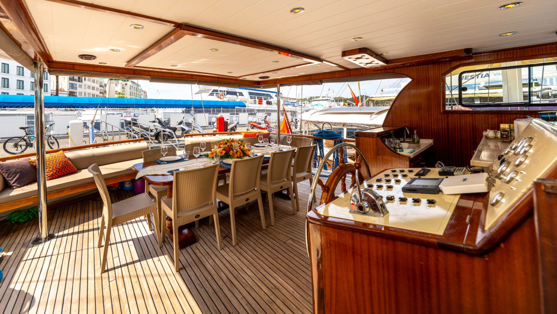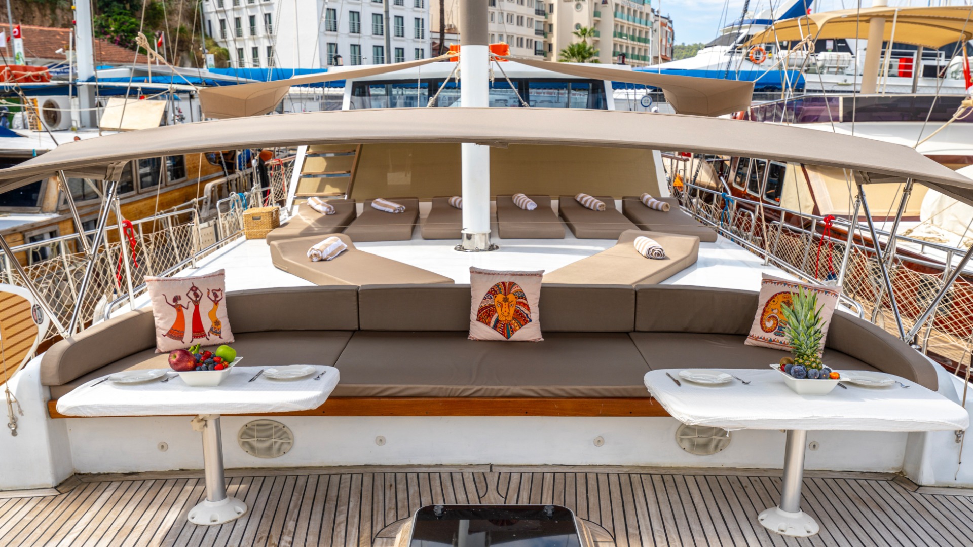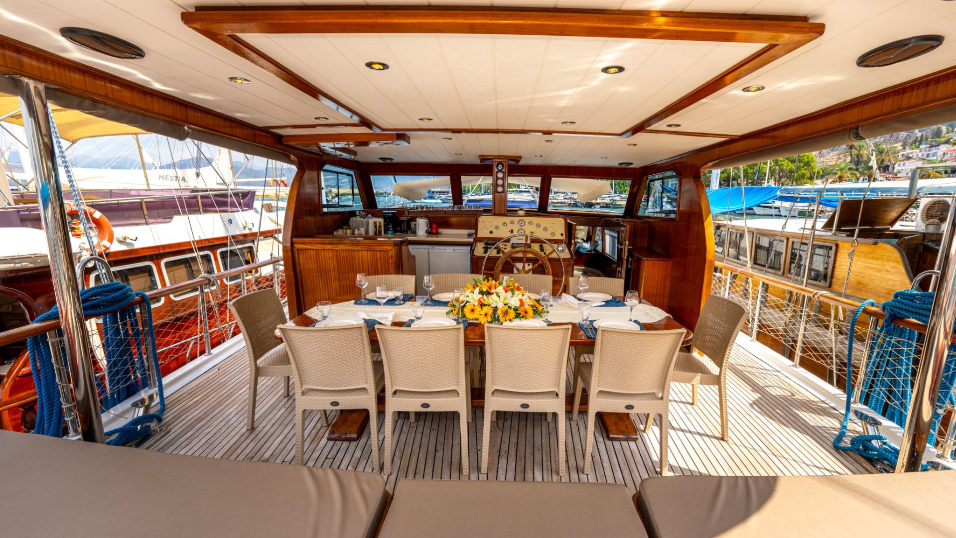 İçeride Wi-Fi, müzik sistemi, LCD TV var ama emin ol, gözün daha çok güvertede olacak. Geniş bir güverte, hafif esen rüzgar, güneşin altında uzanabileceğin yerler... Sabah kahveni içip denize bakmak bile yetiyor bazen.