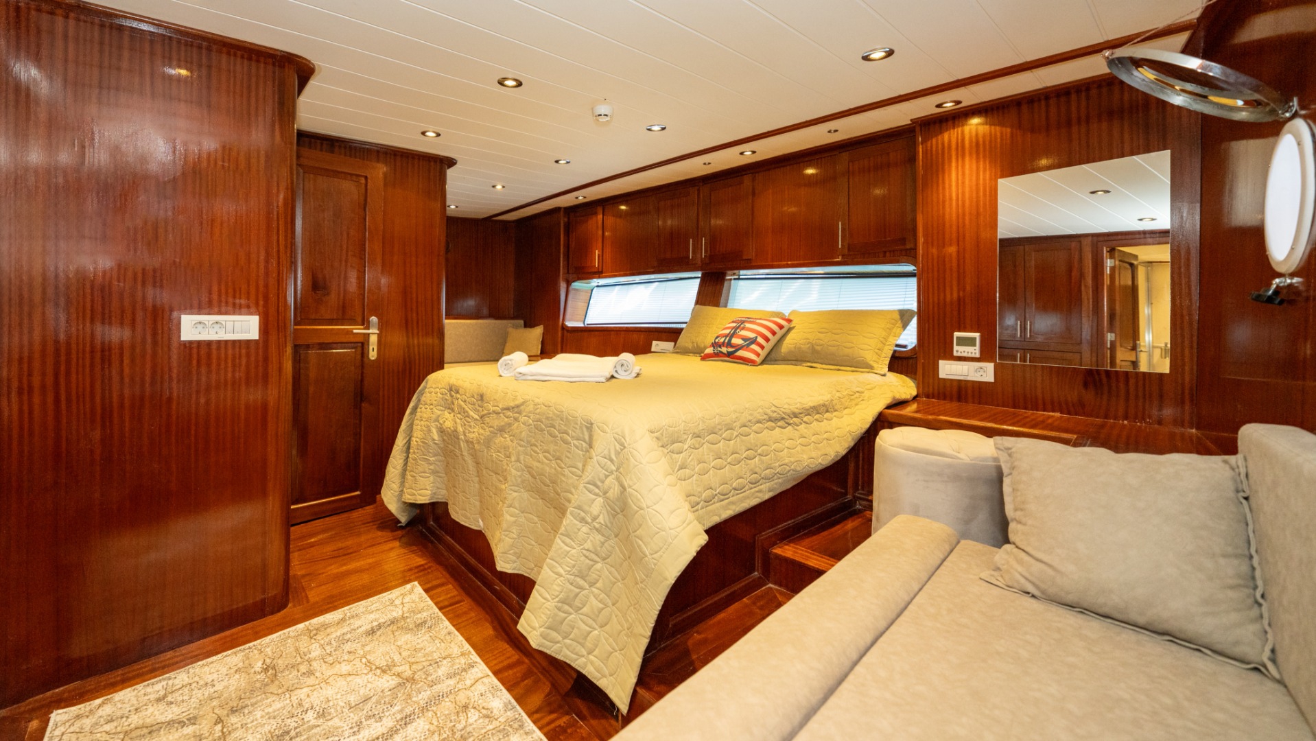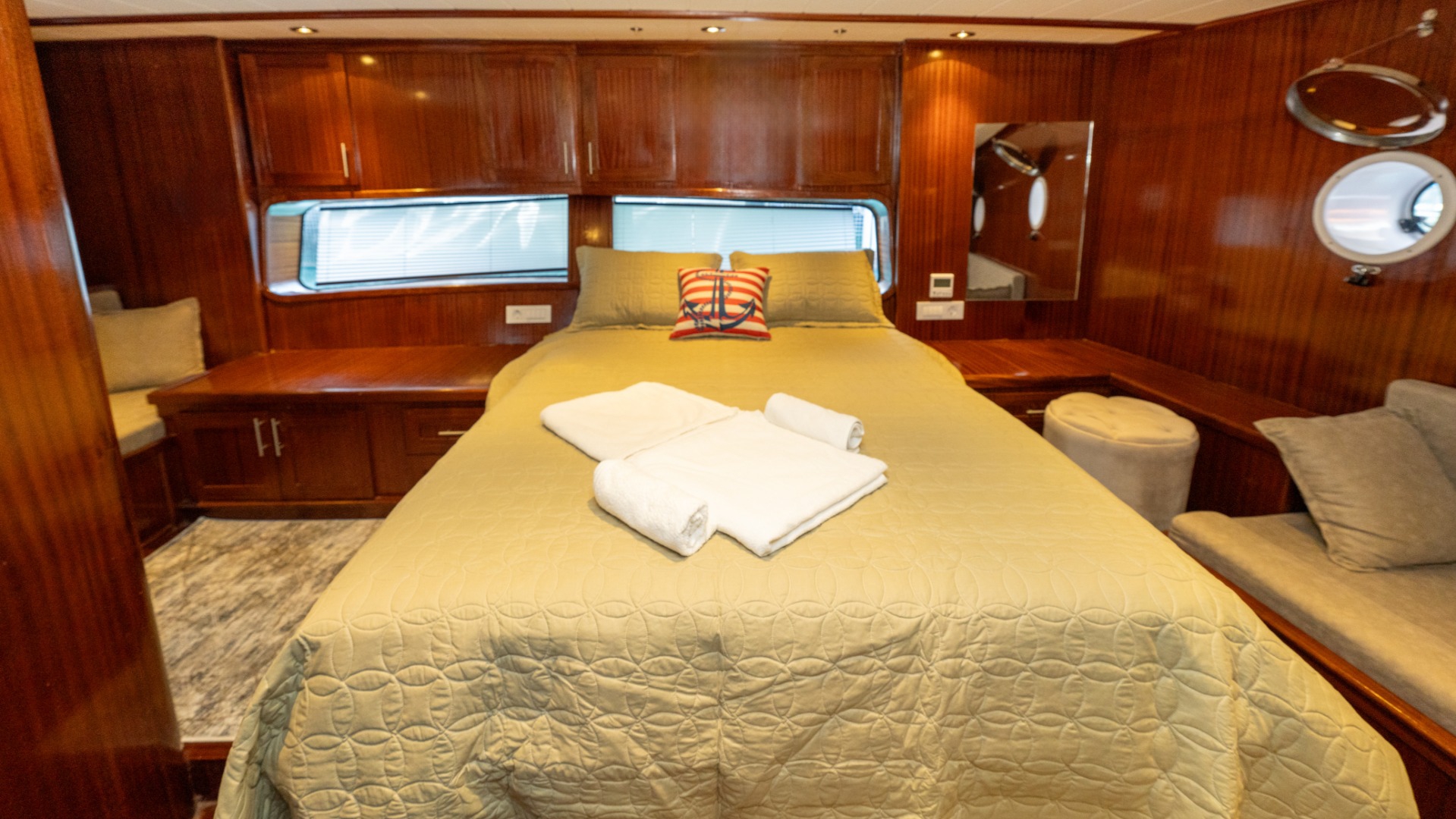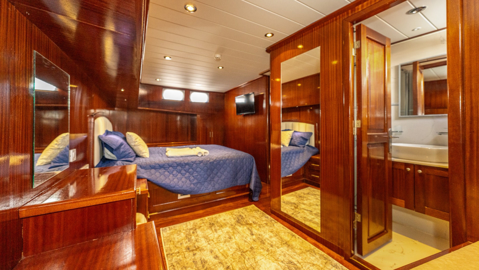 2023’te inşa edilen bu 21 metrelik gulet, ne eksik ne fazla. 4 kabin var: 2’si master, 2’si double. Toplam 8 kişi. Herkes için ayrı bir alan, her kabinde duş, klima. Konfor var ama gösteriş değil. Çünkü gösteriş geçici, huzur kalıcı.