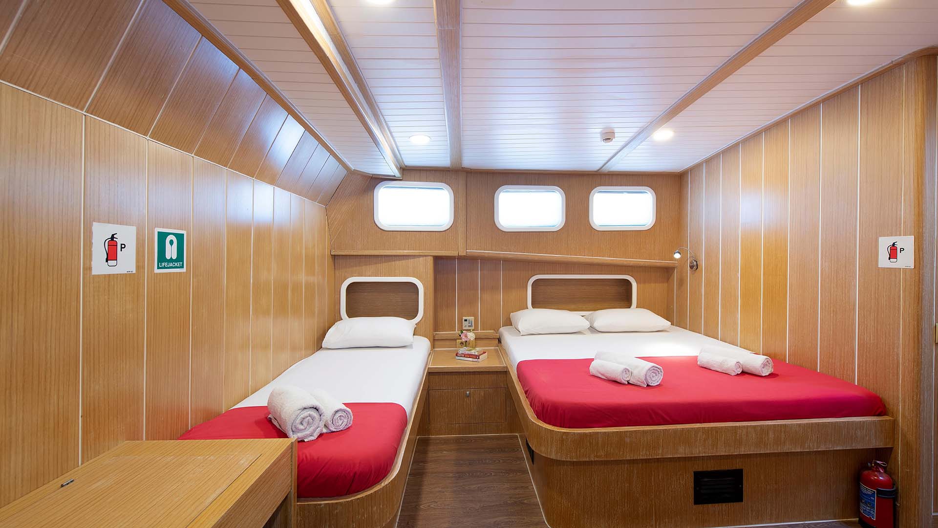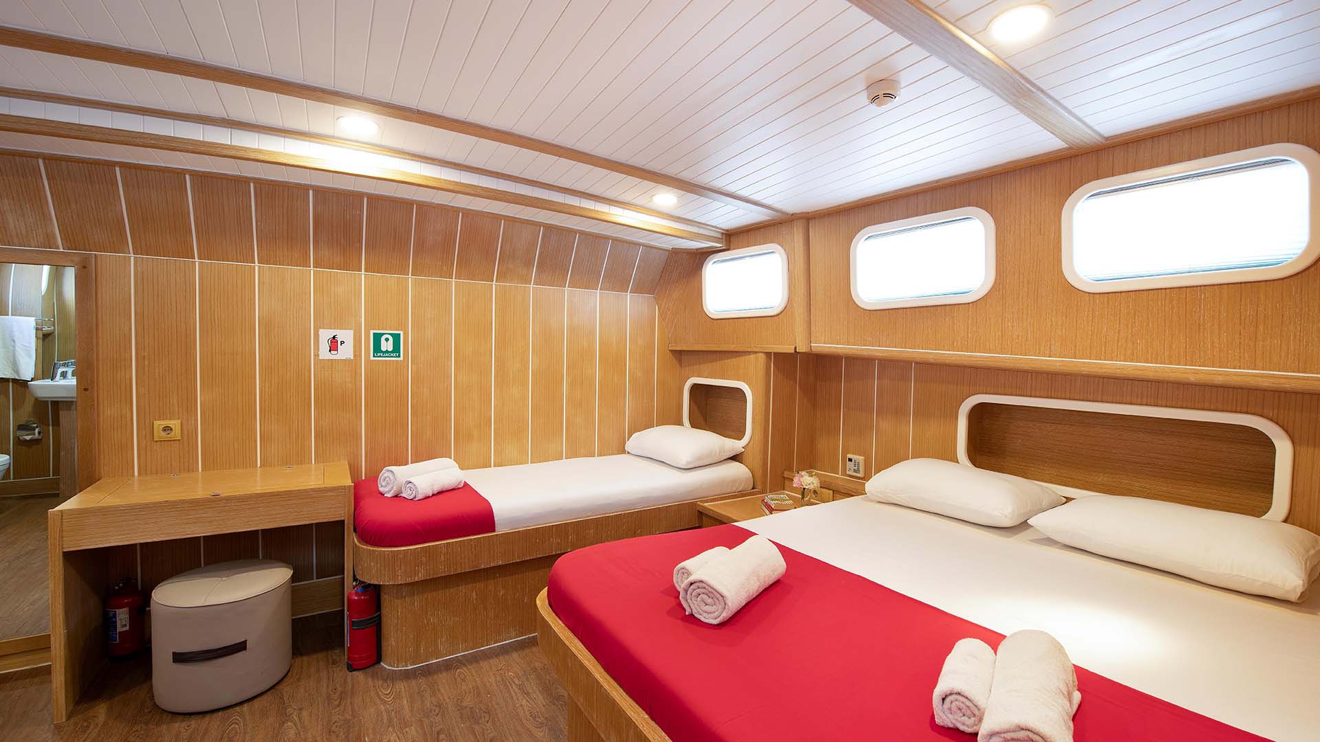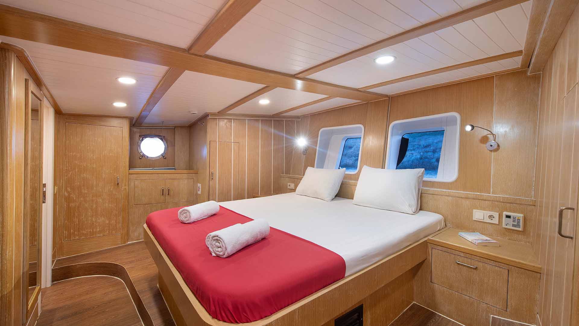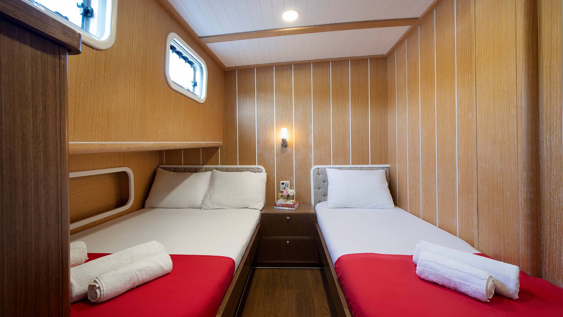 Toplam 8 kabin ile 21 misafir ağırlama kapasitesine sahip olan Oguz Bey, farklı konaklama ihtiyaçlarına uygun bir düzen sunar. 1 master, 2 double, 4 triple ve 1 single kabin ile geniş gruplar için ideal bir yapı oluşturur. Tüm kabinler konforlu bir konaklama deneyimi sunacak şekilde tasarlanmıştır.