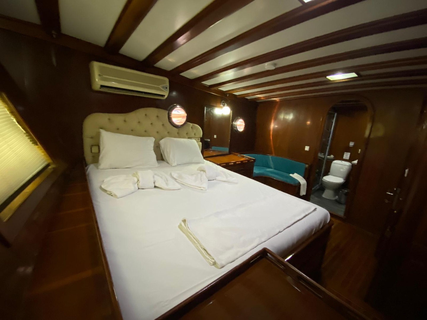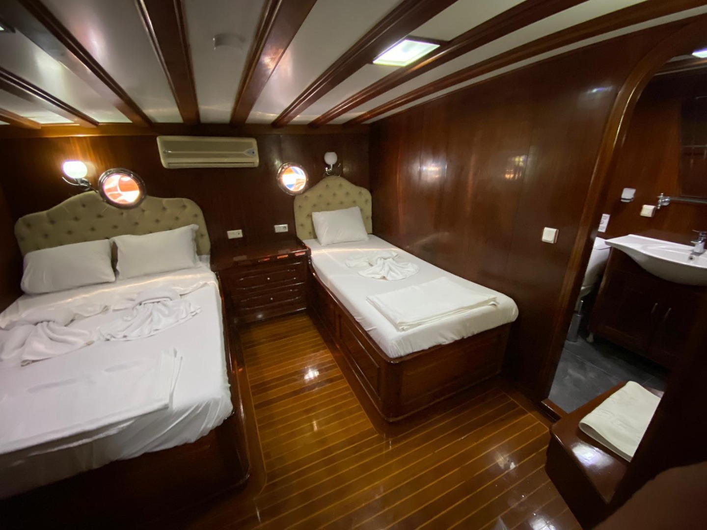 Kabin dağılımı dengeli: 6 double, 2 twin. Klima her yerde var, tuvaletler yenilenmiş, kabinlerde ekran yok ama zaten kimse televizyon izlemeye gelmiyor buraya. İnternet var ama asıl bağlantıyı doğayla kuruyorsun burada.
